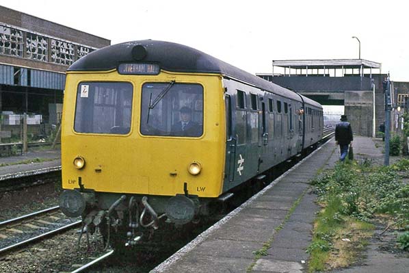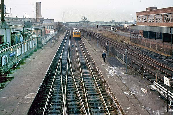 Photo by Alan Young ![]() Looking north from the footbridge as a Cravens Class 105 DMU pulls into the up platform with a Stratford service. A sole passenger waits to board the train – that is one more than usual! In its final years on a Saturday it was not uncommon for a train crew on a shift with four shuttle services between Tottenham Hale and Stratford not to carry a single passenger.
