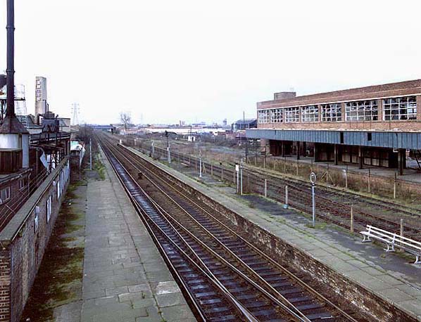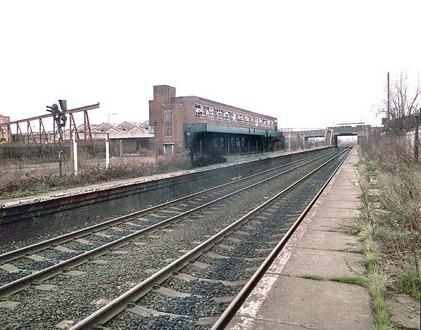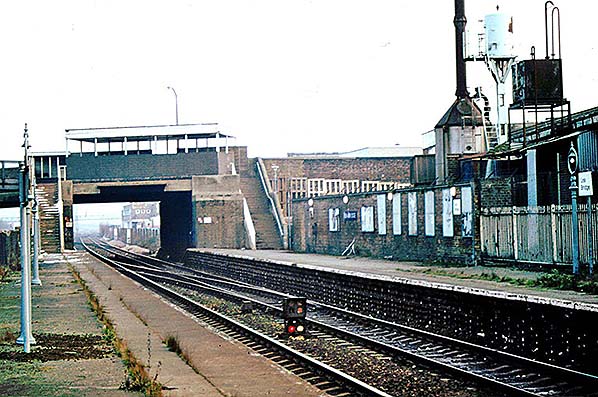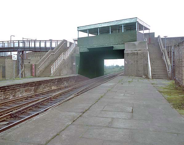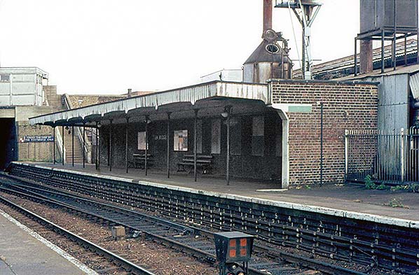 Photo by Alan Young ![]() Looking south from the up platform in February 1984. The down platform shelter has now been demolished with only the back wall remaining. The ‘bus shelter’ on the up platform has also been removed; the only shelter now is at street level. The blue totem signs have been replaced with white BR Corporate Identity signage, although the blue running-in boards remain. The sign inviting people to cross the track by the footbridge has been removed.