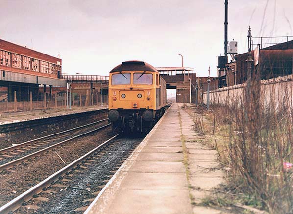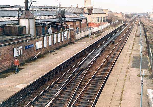 Photo by Alan Young ![]() A Brush Type 4 or Class 47 diesel is seen running light through the down platform at Lea Bridge in 1984. All is not what it seems, however, as the loco is not showing a headlamp at the near end so must be running 'wrong line' or in the process of reversing. There was an apparently well used crossover just behind the locomotive.