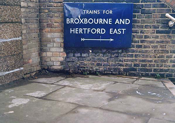 Photo by Brian Gronland ![]() Although BR Eastern Region blue totem signs were removed in the latter half of the 1970s, the running-in boards and other blue signage survived until 1984, the year of this photo. This sign directs people to the down platform, although by this time passengers intending to travel to Broxbourne or Hertford East would need to change at Tottenham Hale.