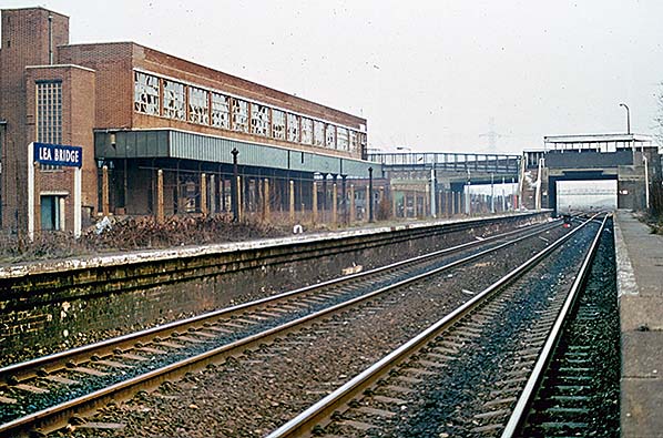 Photo by Alan Young ![]() Lea Bridge up platform seen from the north end of the down platform in February 1984. The parcels depot closed in the latter half of the 1970s and after less than ten years of disuse is already suffering bad vandalism with most of the windows on the upper floor broken. With the station now unstaffed access to the depot from the platform is easy. The high-level bridge from the station building is still in place although presumably access along it is blocked.