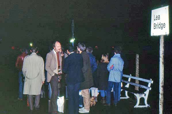 Crowds have gathered at Lea Bridge station on evening in March 1985 as a local acoustic punk-folk band, Aunt Fortescue's Bluesrockers played a gig on the platform to highlight the station’s plight and bad service and forthcoming closure.