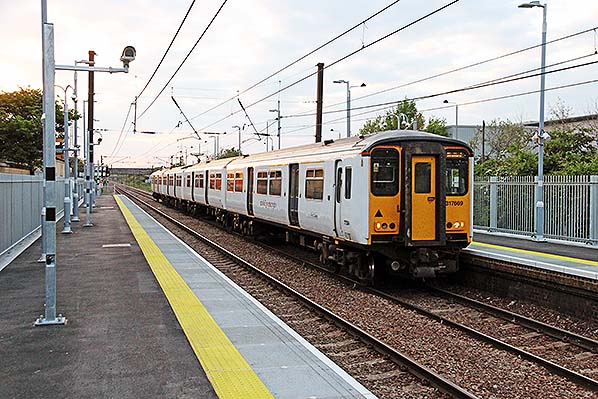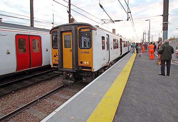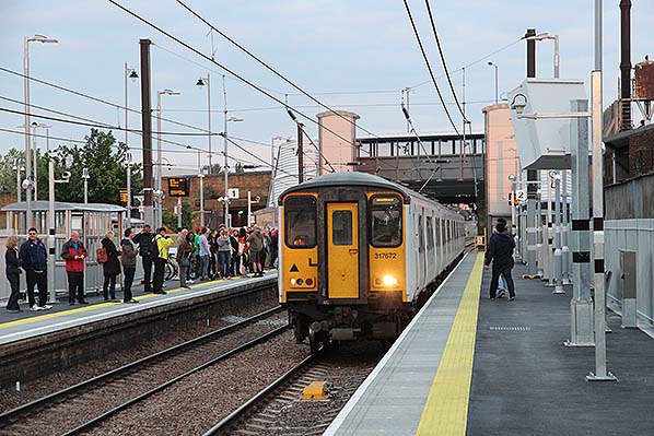![]() Looking north along the up platform during the evening of 15 May 2016. The station is now open with tickets being sold, but the first train has yet to stop. It is indicated on the display and is the 20.14 from Tottenham Hale, due at Lea Bridge at 20.18. Photo by Nick Catford ![]() Looking south along the up platform during the evening of 15 May 2016 before the arrival of the first train to Stratford. The new footbridge, complete with lifts, is seen in the distance. Photo by Nick Catford ![]() Although scheduled as the second train and due to arrive at Lea Bridge at 20.21, recovery time meant the Class 317/6 actually arrived before the 'official' first train; hence the large crowd of people waiting on platform 1. Luckily Richard Allen was on the wrong platform at the right time and obtained an unobscured view of the first arrival.