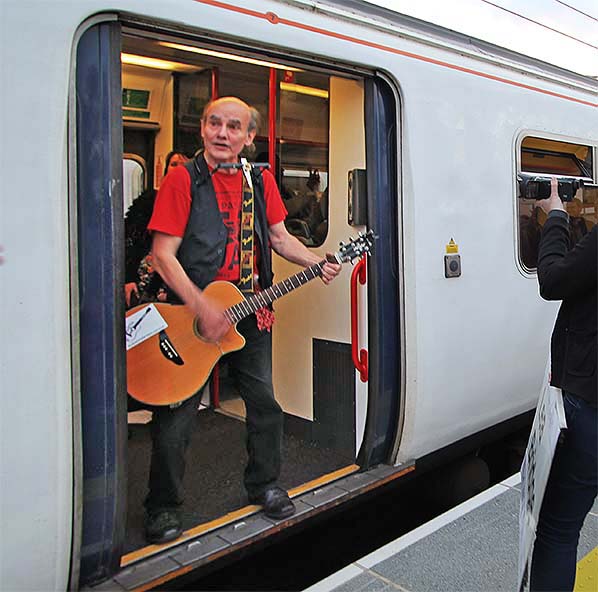 Photo by Nick Catford ![]() One of the passengers on the first train was local musician and railway campaigner Graham Larkbey who had played gigs at the station and on the last train in July 1985.