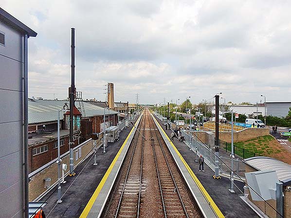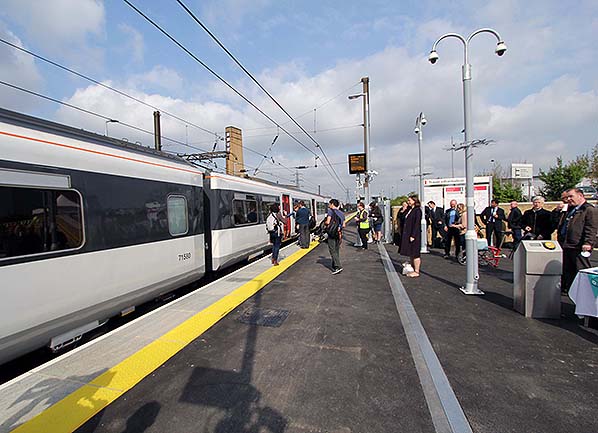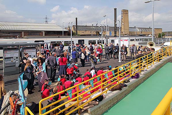 Photo by Nick Catford ![]() Crowds wait for the official opening of Lea Bridge station on 16 May 2016. The 09.33 to Stratford waits at platform 1. The VIP guests will be on the next train, arriving from Tottenham Hale at 10.01