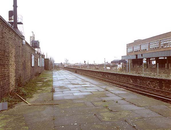 Lea Bridge station looking north along the down platform in January 1986. The wall on the left, which was the back wall of the platform shelter, still retains many posters. Photo by Nick Catford
