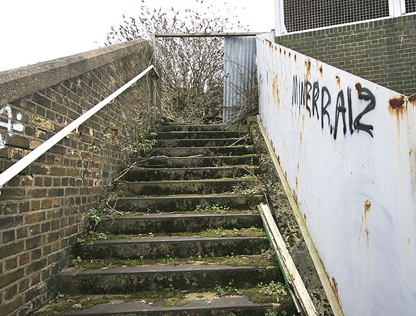 The up platform steps are still passable in January 2008 although bushes have taken hold in the concrete on the top landing. Photo by Nick Catford
