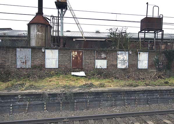 Although the poster boards on the wall at the rear of the down platform are still in place January 2008, none of the posters are readable. Photo by Nick Catford