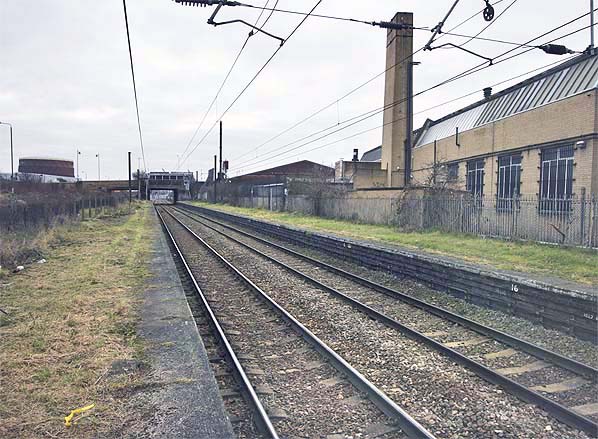Looking south along the up platform at Lea Bridge in January 2008. Lea Bridge Gasworks is seen on the left on the far side of the bridge. Photo by Nick Catford