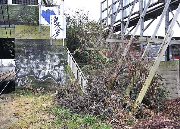 The undergrowth at the south end of the down platform make impossible to use the steps even in winter. The stationmaster's house, now demolished, was on the other side of the hoarding. (January 2008) Photo by Nick Catford