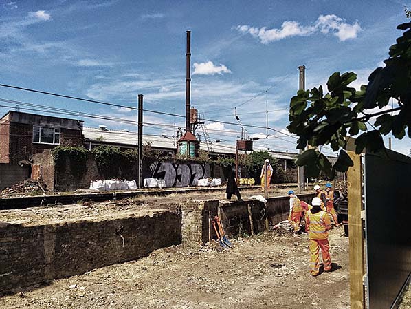 Workmen are busy clearing the station site in June 2015 prior to building the new station. The platform will be retained and resurfaced. Photo by Richard Tist, reproduced from Wikiwand under creative commons licence