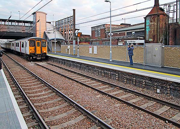 The first train arrives at the reopened Lea Bridge station on 15 May 2016. Although scheduled as the second train and due to arrive at Lea Bridge at 20.21, recovery time meant the Class 317/6 actually arrived before the 'official' first train arrived at the other platform.