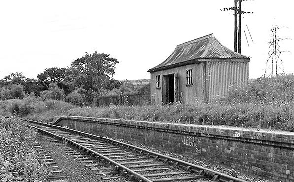 The station was provided with a single platform on the north side of the line. The station building containing the usual passenger facilities was a much smaller version of a standard GWR design seen at many of its stations (including Rhos and Rhostyllen) which were opened or improved circa 1900. The structure was of brick with beneath a hipped slate roof. A canopy extended the length of the building and full width of the platform and carried a saw-tooth, pierced valance. This feature, too, was the standard for GWR stations of the time.At some point a GWR corrugated iron ‘pagoda’ waiting shelter was added. There was a passing loop at Legacy and a siding with loading ramp.