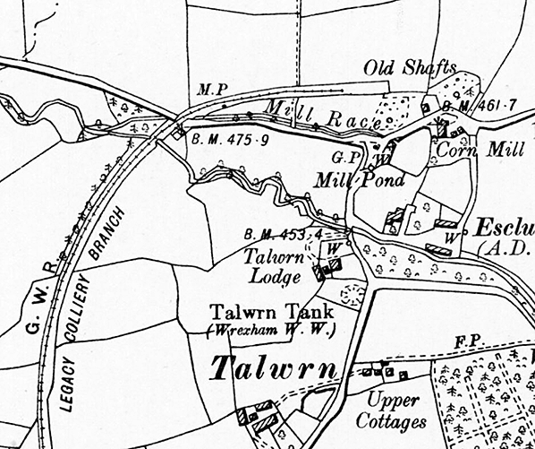 On 27 August 1876 the Great Western railway (GWR) opened the 1¼-mile Legacy Branch, a northern extension of the Ponkey Branch which had opened from Gardden Lodge Junction, on the Shreswbury and Chester line, to Ponkey on 1 August 1868. The Legacy branch was built to serve the Legacy Colliery which one historical source states had closed in 1875 after only a 5-year working life. Although there may have been coal stocks at the surface of the Legacy Colliery after closure they cannot have lasted long and so, very shortly after opening the Legacy Branch would have had no purpose. The 6-inch scale OS map of 1898 (see below) shows the northern end of the branch stopping just short of the site of the colliery site (shown as ‘Old Shafts’). It can only be presumed that the line was out of use and had been for many years.