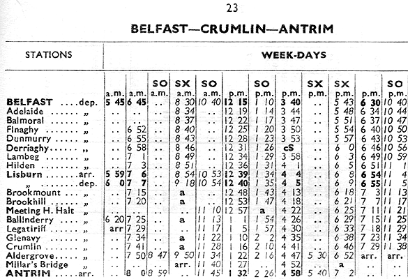 The 3 September 1956 timetable (see extract below) showed 4 trains to Antrim, 1 to Crumlin and 6 to Belfast Great Victoria Street Monday-to-Friday. On Saturdays there were 5 trains to antrim, 2 to Crumlin and 6 to Belfast Great Victoria Street. No trains ran on Sundays.