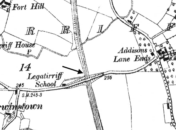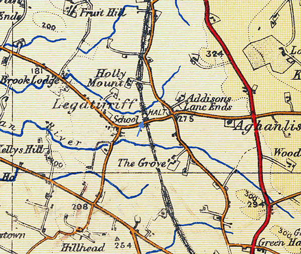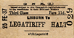 Notes: Legatiriff Halt was opened in 1936. It was situated on the 20 mile Lisburn – Antrim branch of the Great Northern Railway Ireland (GNRI). The branch was opened by the Dublin & Antrim Junction Railway (DAJR) on 13 November 1871 and became part of the GNRI in 1879. It connected the GNRI Belfast – Dublin main line at Knockmore Junction (Lisburn) to the Belfast – Coleraine line of the London Midland & Scottish – Northern Counties Committee (LMS-NCC) at Antrim.
