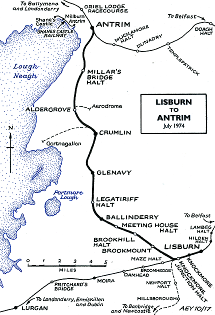 Legatiriff Halt would have been served by local trains running between Belfast Great Victoria Street and Antrim.