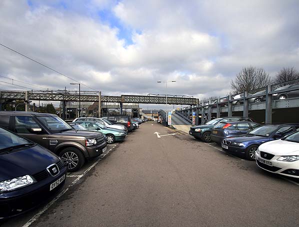 ![]() Looking north along the site of the Dunstable line trackbed towards Leighton Buzzard station in January 2011. The southern end of the platforms was just under the footbridge.