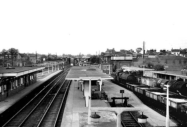 ![]() Leighton Buzzard looking north in September 1959. Freight trains stand in both Dunstable line platforms. Note the original platform canopy on the up Dunstable platform has been replaced.