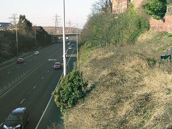 ![]() Station Name: LISCARD & POULTON![]() Looking west at the site of the access road that led down to a siding that was located at the west end of the station. The station was located to the left where the road can be seen.