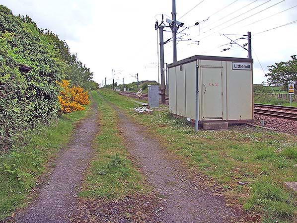 The access track to the former goods yard and whinstone quarry loading area is seen in May 2009, looking south from Little Mill level crossing. The installation in the foreground bears a sign ‘Littlemill’, whereas railway practice has been to use the form ‘Little Mill’. Beyond it the trackside sign for Little Mill Junction is visible referring to the crossovers between the up and down lines; both lines are signalled for bi-directional running. Also in the distance, on the far side of the main line, the preserved lime kiln can be seen.