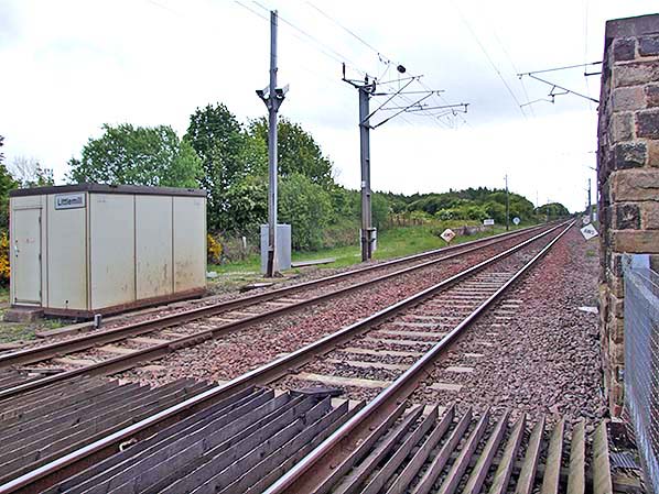 This view southward from the level crossing at Little Mill (May 2009) includes the base of the old signal box (right) now serving as a relay room, and a modern installation (left) with a ‘Littlemill’ (rather than the traditional ‘Little Mill’) nameplate. In the distance, on the far side of the tracks, the sign for Little Mill Junction can be seen adjacent to the old stone loading platform.