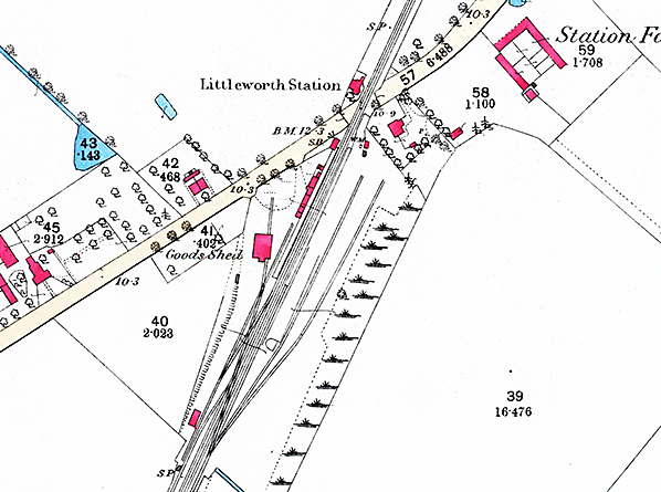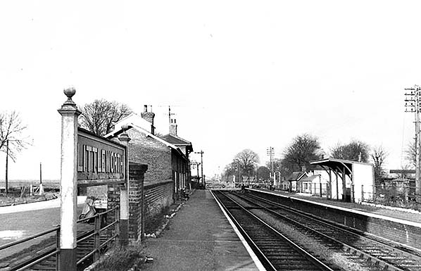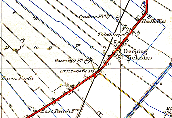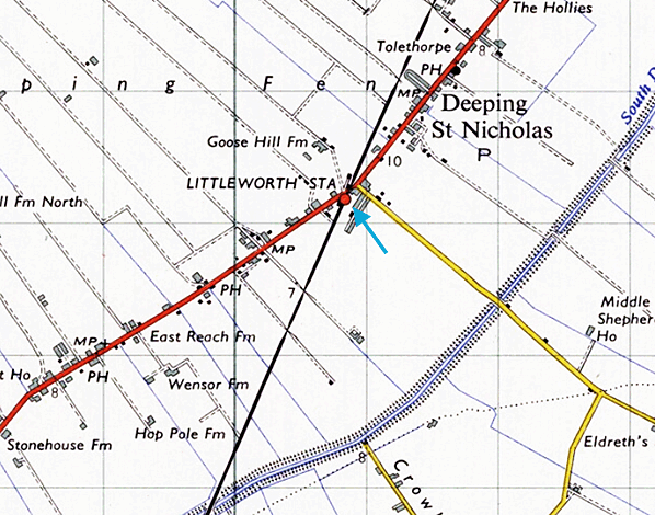 Notes: Littleworth opened with the loop line on 17th October 1848. The station was sometimes known as Littleworth and Deeping Fen and was actually sited in the village of Deeping St. Nicholas. The signal box was sited at the north end of the down platform adjacent to the crossing; this controlled the crossing and access to the goods yard which was sited on both sides of the line to the south of the crossing. There were two sidings on the down side one passing through a brick goods shed with a 1 ton 10 cwt crane nearby and the other serving a loading dock behind the down platform. There were two further sidings on the up side.