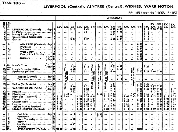 The September 1956 - June 1957 timetable listed 37 weekday departures from the main line platforms: the first was at 5.05 am to Stockport Tiviot Dale. The last departure was at 10.10 pm, also to Stockport Tiviot Dale, but via Manchester Central. There were regular services throughout the day to Manchester Central and to Warrington. Other services ran to Gateacre, Hull, Nottingham Midland, Tanhouse Lane (Widnes) and Harwich. At 9.30 pm a train left for London Marylebone.