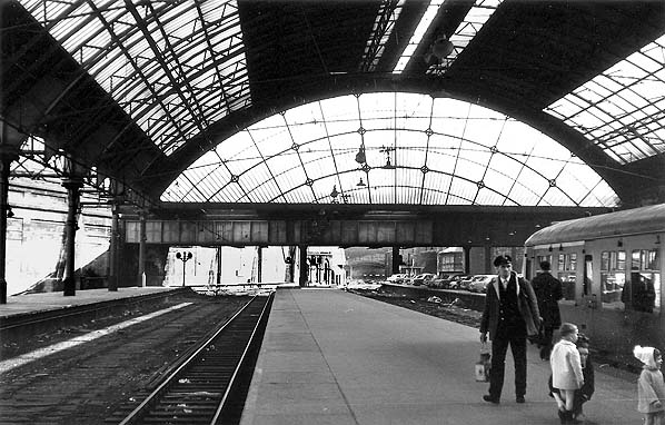 Looking south along platform 4 at Liverpool Central station in April 1969. At the far end can be seen the colour light signals that were first introduced in 1934. To the right, a DMU waits to depart for Gateacre. A railwayman carries the tail lamp which would have been fitted to the rear of the DMU. Although the station looks derelict, efforts had been made to keep the active platforms, 3 and 4, in a clean and tidy condition.