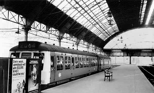 In August 1969 a two car Derby Built class 108 DMU stands at platform 4 at Liverpool Central station waiting to depart for Gateacre. Station staff had gone to great efforts to ensure that the platform was in a clean and tidy condition in what had become by that date an increasingly dilapidated station. Only platform 4 and platform 3, seen to the right, still had track in situ at this time.