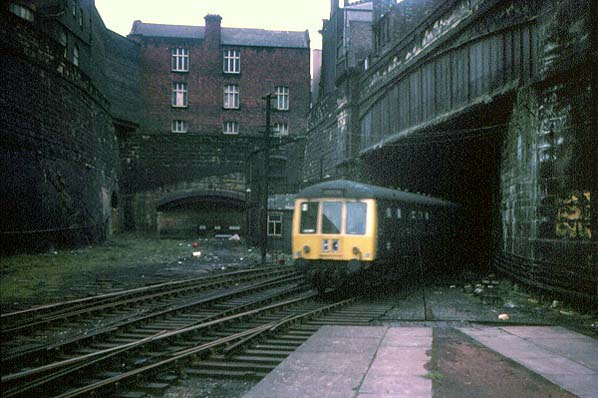 A two car class 108 DMU emerges from the Great George Street tunnel and heads into Liverpool Central station in 1971. Track rationalisation had already begun. The picture was taken from the southern end of Platforms 1 and 2. The train would have been operating on a Gateacre to Liverpool Central service. The turntable pit is to the left of the dmu in front of the alcove in the wall.