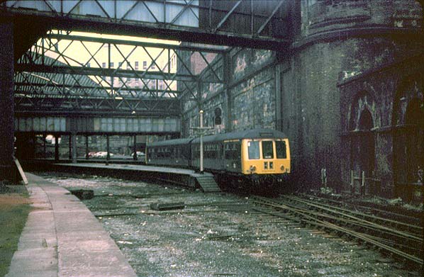 Looking north at Liverpool Central station from the southern end of platform 2 in 1971. A Gateacre train can be seen arriving at the station. The original station and all of its features were extant at this time but track had been removed from all platforms except number 4.