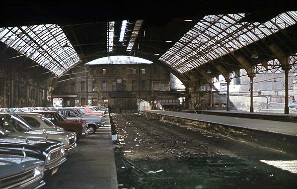 Looking north at Liverpool Central station from the southern end of platform 2 in 1971. The western side of the station had become a car park. Although the station appears to be closed to rail traffic it was in fact still open but had only one rail served platform.