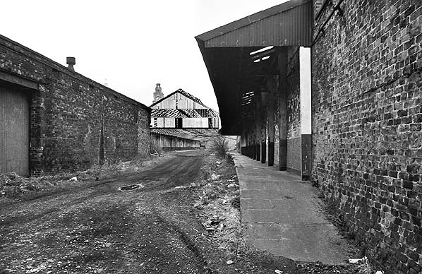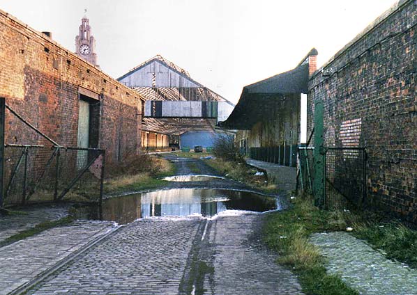 A view looking south at Liverpool Riverside station in November 1988. The track had been removed from within the station but the tramway section was still in situ.