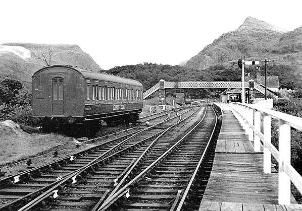 Llanberis station looking south-east from the ticket platform in the 1950s.To the left can be seen a camping coach. Camping coaches dated back to the 1930s and were old stock converted into holiday accommodation. They were placed at stations in scenic spots and could be rented for a week by families. British Railways expanded the number of camping coaches, and they