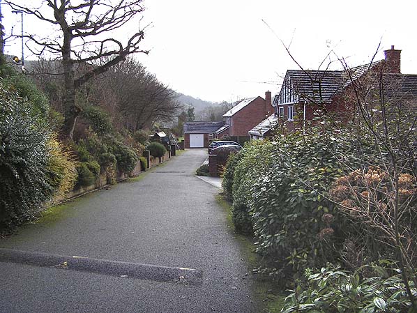 ![]() Looking south at the site of Llanfynydd Station in December 2009. The ramped driveway is the original access route to the station. The houses occupy the station site and the trackbed. The small goods yard was at the bottom of this drive.