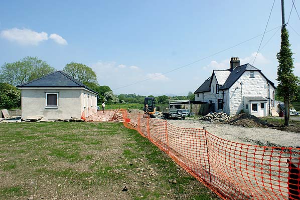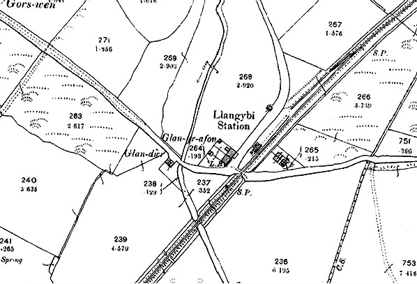 Llangybi was in an isolated location and did not open with the line. There was a level crossing at the location, and from March 1869 trains picked up passengers for fairs and markets only. It is unlikely that there were any facilities at Llangybi at this time. On 4 July 1870 the CR had become part of the London & North Western Railway (LNWR). From October 1870 Llangybi was shown in the Bradshaw timetable as having trains on Tuesdays only; by January 1872 it had services every day. A single-storey stone building and a platform were provided on the north side of the level crossing, west of the line. The building had a booking and parcels office. The platform was to the north of the building and had a timber face backfilled with cinders. The station was also provided with a siding on the west side of the line, north of the station. Accommodation in the form of two cottages was provided for staff on the east side of the line.