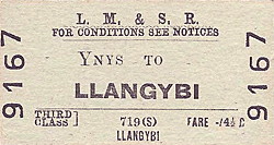 On 1 January 1923 Llangybi became part of the London Midland & Scottish Railway (LMS). By 1928 they were running nine up and seven down trains. The service was the same in the summer of 1932. In 1938 the siding at Llangybi was taken out of use and lifted.