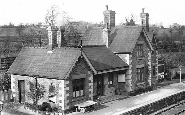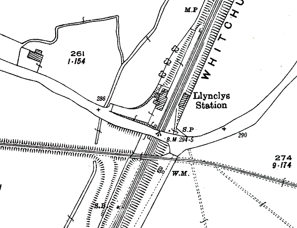 The station was located a short distance to the east of its village namesake to the north of what later became the B4396 road. The road passed over the railway on a bridge and the station was immediately to the north of it. At the time of opening the line was a single track railway but there was a passing loop at Llynclys. The station building, which possessed both dignity and charm, was on the up side (Oswestry direction) of the line. It consisted of a two-storey stationmaster’s house, both the taller section and recessed section having scalloped bargeboards and finials adorning the gables. The offices and waiting facilities were in a single-storey wing; the end of this range was given a gable and bargeboard and finial to complement the stationmaster’s house, and the section adjoining the house was recessed, its roof extending forwards to provide shelter.