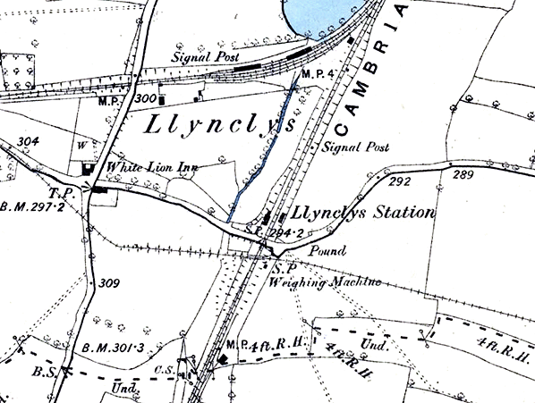 Llynclys was also provided with goods facilities. They were located to the south of the road overbridge and were approached by a driveway on the east side of the line. The goods facilities included a goods shed located on the east side of the line, sidings, a weighing machine and cattle pens.