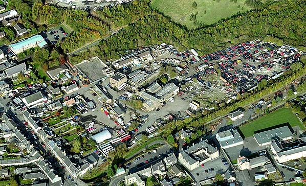 Aerial view Loanhead station and Ramsey colliery site. The station building can be seen in the centre near the bottom. Several original colliery buildings survive.
