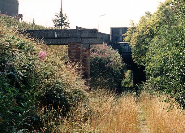 Support for the water tank south-east of Loanhead station in August 1995. The track