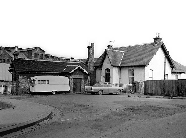 Loanhead station forecourt c.1974. Ramsey colliery buildings are seen in the background.