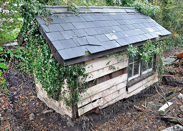 Login station ground frame cabin after the undergrowth and soil around it has been cleared.