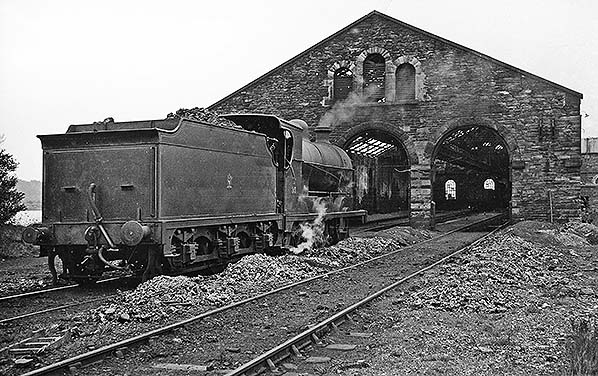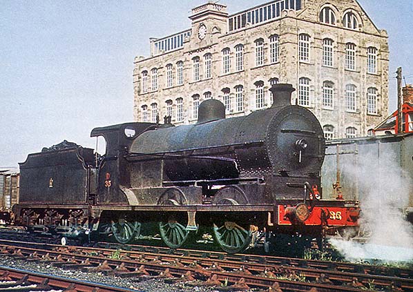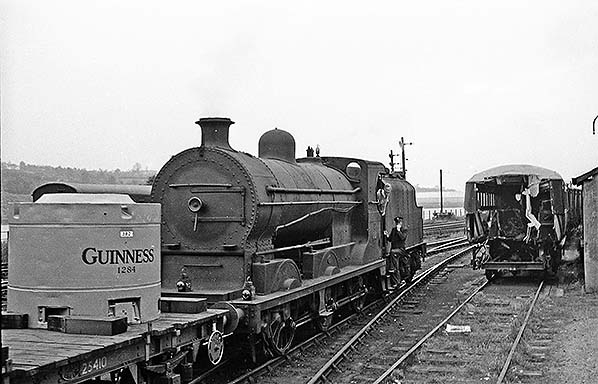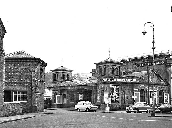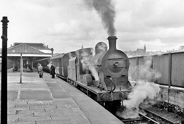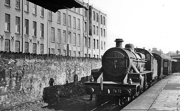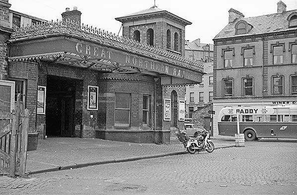 Photo by Roger Joanes from his Flickr photostream ![]() The 'Little Gaelic Singers' line up for a group photograph at Foyle Road in January 1959. They were en route to the USA and a Derry Journal photograper had turned out to capture the scene. To the right of the group at the departure platform is a BUT railcar which would have been operating on a Belfast Great Victoria Street service. Copyright photo from the Derry Journal ![]() A view looking north-east along the Londonderry Foyle Road island platform in October 1959. Branching off to the right just before the trainshed is the connection to the Londonderry Port & Harbour Commission railway which ran along the quay and crossed the Craigavon Bridge. In the distance the LP&HC weighbridge can be seen. Pulling away from the station is a BUT railcar. Photo from the Jim McBride collection ![]() Londonderry Foyle Road and City Goods stations seen from the Craigavon Bridge in 1960. The passenger station at Foyle Road is seen to the left and the goods station is to the right. Also seen in front of City goods is the 'Transit Shed' which burned down in 1961. Opened in 1877 'City Goods' had initially served the Belfast & Northern Counties Railway who had their Waterside terminus on the east side of the River Foyle. Photo by Ben Brooksbank Standing at the arrival platform at Foyle Road in 1960 is ex-LMS NCC 2-6-0 'Mogul' class locomotive number 98 'King Edward VIII'. The engine was built in 1937 at York Road in Belfast. The engine was withdrawn in August 1964. Photo by John Richardson ![]() UTA 0-6-0 x class locomotive number 35 (ex-GNRI 202) is seen in Foyle Road goods yard in 1961. The engine was built in 1921 and withdrawn in may 1965. Dominating the view is the Star shirt factory. Photo by P B whitehouse ![]() Looking south-west along the island platform at Londonderry Foyle Road station on 21 July 1962. Standing at the arrival platform (right) is a recently arrived service from Belfast Great Victoria Street. The train is formed of a BUT railcar. To the left the connection to the LP&HC lines can be seen. The LP&HC lines officially closed at the end of August 1962. Photo from the Jim McBride collection ![]() The south end of the Londonderry Foyle Road station platform seen looking south-west on 21 July 1962. The Craigavon Bridge, opened in 1933, straddles the end of the platform. Its predecessor the Carlisle Bridge (opened in 1863) had been located just beyond the end of the platform. Londonderry North signal cabin can be seen in the distance. Standing at the arrival platform (right) is a BUT railcar. The coach that is still in its GNRI livery of blue and cream had been converted from steam hauled stock. The large building seen to the right was the Tillies & Hendersons shirt factory. It famously featured in Karl Marx's book about capitalism 'Das Kapital'. Photo from the Jim McBride collection ![]() Photo by E M Patterson ![]() In September 1962 BUT railcar number 135 (ex GNRI 908) is seen at the arrival platform of Londonderry Foyle Road. Number 135 was the very last railcar that had been built for the GNRB in 1958. The tail lamp is absent so the train was probably about to move out of the passenger station and go into the sidings on the south side of the Craigavon Bridge. It would then have moved into the departure platform (right) to form a service to Belfast Great Victoria Street. The UTA started to apply half yellow fronts to its railcars from November 1960. In 1961 they added the black wasp stripes. Photo by J D FitzGerald curtesy of Colourpoint On 3 April 1963 UTA 4-4-0 U class locomotive number 67 'Louth' (former GNRI number 202) prepares to leave Londonderry Foyle Road station on a one coach passenger service to Omagh. The engine had been built in 1948 by Bayer Peacock and was withdrawn in May 1965. Photo by Roger Joanes from his Flickr photostream ![]() The main entrance to Londonderry Foyle Road station seen in 1963. This entrance building was built by the INWR in 1870. In the background a bus of the CIE can be seen. It is an ex-GNRI vehicle on a Sligo to Derry service. Copyright photo from Ernies Railway Archive ![]() On 2 July 1963 4-4-0 ex-GNRI S class locomotive number 171 'Slieve Gullion' is seen departing from Londonderry Foyle Road station on the 12.55pm servive to Belfast Great Victoria Street. When the GNRB was broken up in 1958 this locomotive had passed into CIE ownership but was purchased by the UTA in April 1963 to serve the 'Derry Road'. Under CIE ownership it had retained its GNRI blue livery and its original number. This locomotive was later preserved by the RPSI. Photo by F D FitzGerald curtesy of Colourpoint ![]() Londonderry Foyle Road station seen from Bridge Street on 15 July 1963. The UTA had made little attempt to rebrand the station when it took over from october 1958. Only the poster boards carried UTA lettering. On the main entrance Great Northern Railway still dominated. Photo from an Ulster Transport Authority negative ![]() The former GNRI Londonderry Locomotive shed seen in November 1963. By this time the shed had lost its allocation of locomotives but as this photo dempnstrates it was still used for stabling. The engine is an ex-GNRI 0-6-0 SG class locomotive that had been built in 1920. The UTA gave it the number 35. It would later work an overnight goods service to Belfast Grosvenor Road Goods station. Copyright photo from Ernies Railway Archive ![]() In October 1963 UTA railcar 101 (former GNRI railcar A) was involved in a shunting accident at Foyle Road. It is seen in this view taken shortly after the accident in one of the goods sidings. Because of the damage the railcar was withdrawn in April 1964. To the left is an ex-GNRI 0-6-0 SG class locomotive, number 32 (GNRI number 13), engaged on shunting Guiness tanks. The engine was built in 1920 and withdrawn in May 1965.