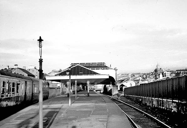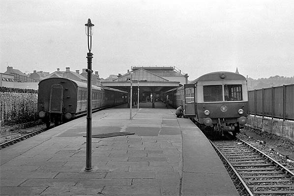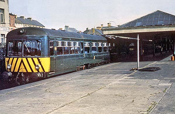 ![]() Londonderry Foyle Road station on 19 August 1959. The arrival platform is to the left and the departure platform is to the right. A Belfast Great Victoria Street service formed of a BUT railcar is seen at the departure platform. The railcar was still in GNRI livery but a UTA crest had been added. It was one of only eight single ended BUT railcars.
