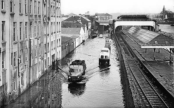 In March 1965 the city of Derry/Londonderry suffered with flooding. In this view looking north from the Craigavon Bridge Londonderry Foyle Road station can be seen. It had seen its last passenger trains on 14 February 1965 but the track would remain in situ until the Autumn of that year.