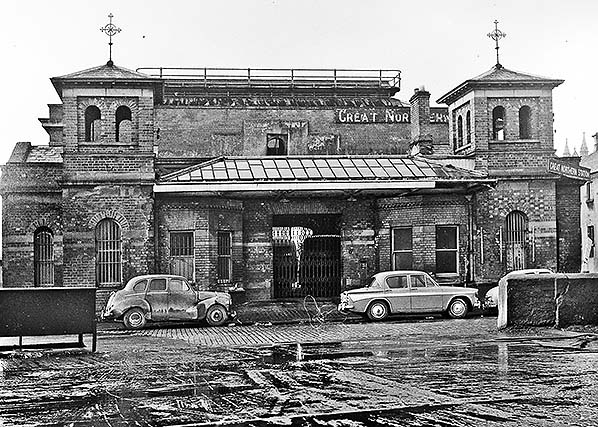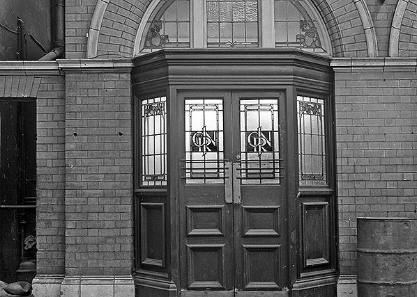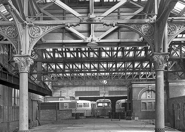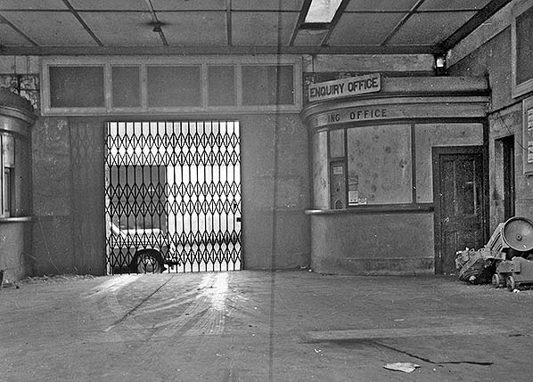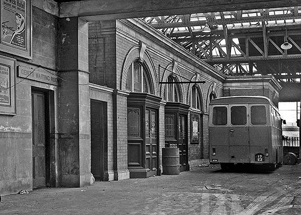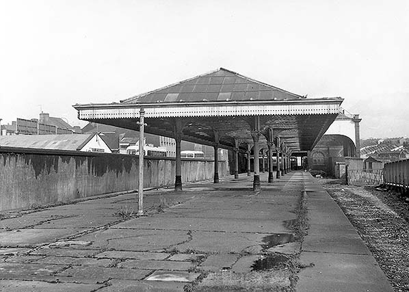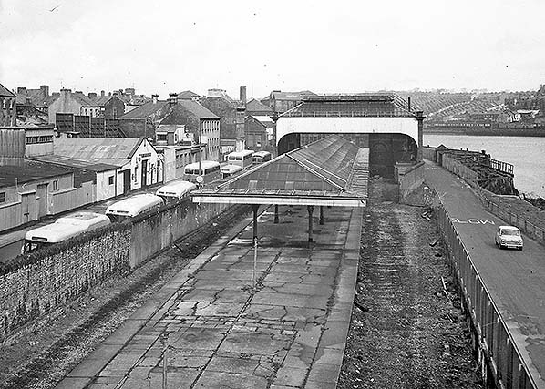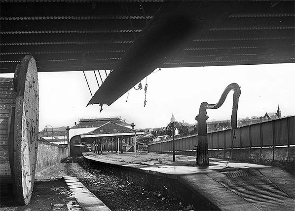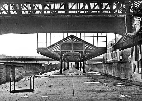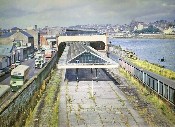 Copyright photo from the John Mann collection ![]() Looking north-east along the platform at Londonderry Foyle Road station from underneath the Craigavon Bridge in the early months of 1966.The track had been lifted in the late Autumn of 1965. Copyright photo from the John Mann collection ![]() Londonderry Foyle road station seen after closure in the early months of 1966. Copyright photo from the John Mann collection ![]() Looking north-east from the forecourt end of the Foyle Road island platform in the early months of 1966. Prior to the alterations of 1887 there had been two seperate platforms inside the trainshed abuting the side walls with three tracks in between them. Those earlier platforms had been installed when the trainshed was built by the INWR in 1870. The 1887 alterations that had been carried out by the GNRI resulted in the northern end of the trainshed being used a concourse area which was provided with refreshment rooms and offices. Because part of the trainshed had been used in this way a new island platform had to be installed that extended further to the south. The island platform was provided with a canopy which can be seen in the foreground with its decorative GNRI motifs. The train shed seen in this view (beyond the canopy) was a replacement that was errected by the GNRI in 1911. Copyright photo from the John Mann collection ![]() Londonderry Foyle Road station looking north-east from the upper deck of the Craigavon Bridge in the early months of 1966. The ballast shows signs of recent track lifting. The track was lifted in the late autumn of 1965. A service road had been built over the course of the former LPHC lines (left). Copyright photo from the John Mann collection ![]() The entrance to the Londonderry Foyle Road refreshment rooms seen in the early months of 1966. These refreshment rooms were located within the trainshed and had been built by the GNRI in 1887. GNRI lettering in stained glass can be seen in the doors. Copyright photo from the John Mann collection ![]() Looking out towards the street through the main entrance of Londonderry Foyle Road station in the early months of 1966. The booking and enquiry offices can be seen on both sides of the entrance. This entrance hall was located inside a building that was built by the INWR in 1870. Copyright photo from the John Mann collection ![]() In this view looking north-east in the early months of 1966 the GNRI island platform canopy of 1887 is shown to good effect. When the island platform was installed it extended further to the south than the originals had and most of its length was outside of the trainshed. Therefore a canopy was required to protect passengers from the weather. Copyright photo from the John Mann collection ![]() A view looking south-west from Londonderry Foyle Road entrance hall of 1870 into the trainshed of 1911. This view was taken after the station had closed in the early months of 1966. At that time the station was being used to garage buses by the UTA. To the left of the bus can be seen the refreshment rooms building that was installed by the GNRI in 1887. Copyright photo from the John Mann collection ![]() Photo by Billy Mooney ![]() A desolate scene at Londonderry Foyle Road station in the early months of 1966. This view is looking south-west from inside the 1911 trainshed along the 1887 island platform. Copyright photo from the John Mann collection ![]() Londonderry Foyle Road station looking north-east from the Craigavon Bridge in September 1968. To the left on Foyle Road buses wait their next duries. The green and cream bus in the foreground was off the Londonderry & Loch Swilly Railway company. The next bus to it was of the UTA and the red bus in the distance was of the County Donegal Railway company. On the far side of the River Foyle Derry/Londonderry's only surviving railway station, Waterside, can be seen.