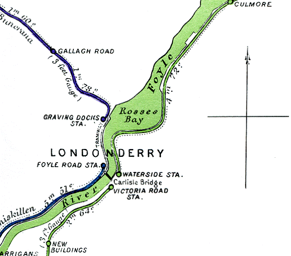 On 1 August 1900 a rival company, the Donegal Railway (DR), opened a line between Strabane and Waterside. The DR station, called Victoria Road, was located directly opposite Foyle Road station on the east bank of the River Foyle and to the south of the Carlisle Bridge. The DR line was a 3ft gauge railway which connected into their 75 mile long system at Strabane (by 1909 that system had finally expanded to be 124 miles). The line had been opposed by the GNRI as it took traffic away from its Strabane – Derry/Londonderry route. Mixed gauge track on the Carlisle Bridge allowed DR wagons to reach the city in the same way as BNCR ones did over the LP&HC lines which had been converted to mixed gauge in 1885. The opening of Victoria Road completed the main line railways of Derry Londonderry as shown on the Railway Clearing House map below.