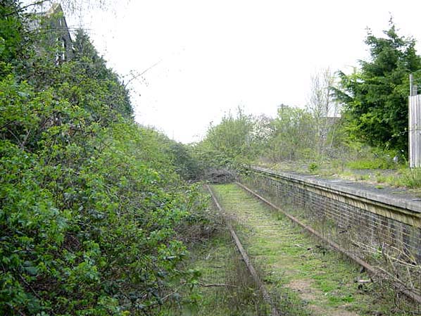 Overgrown track and up platform at Long Stanton Station in April 2005